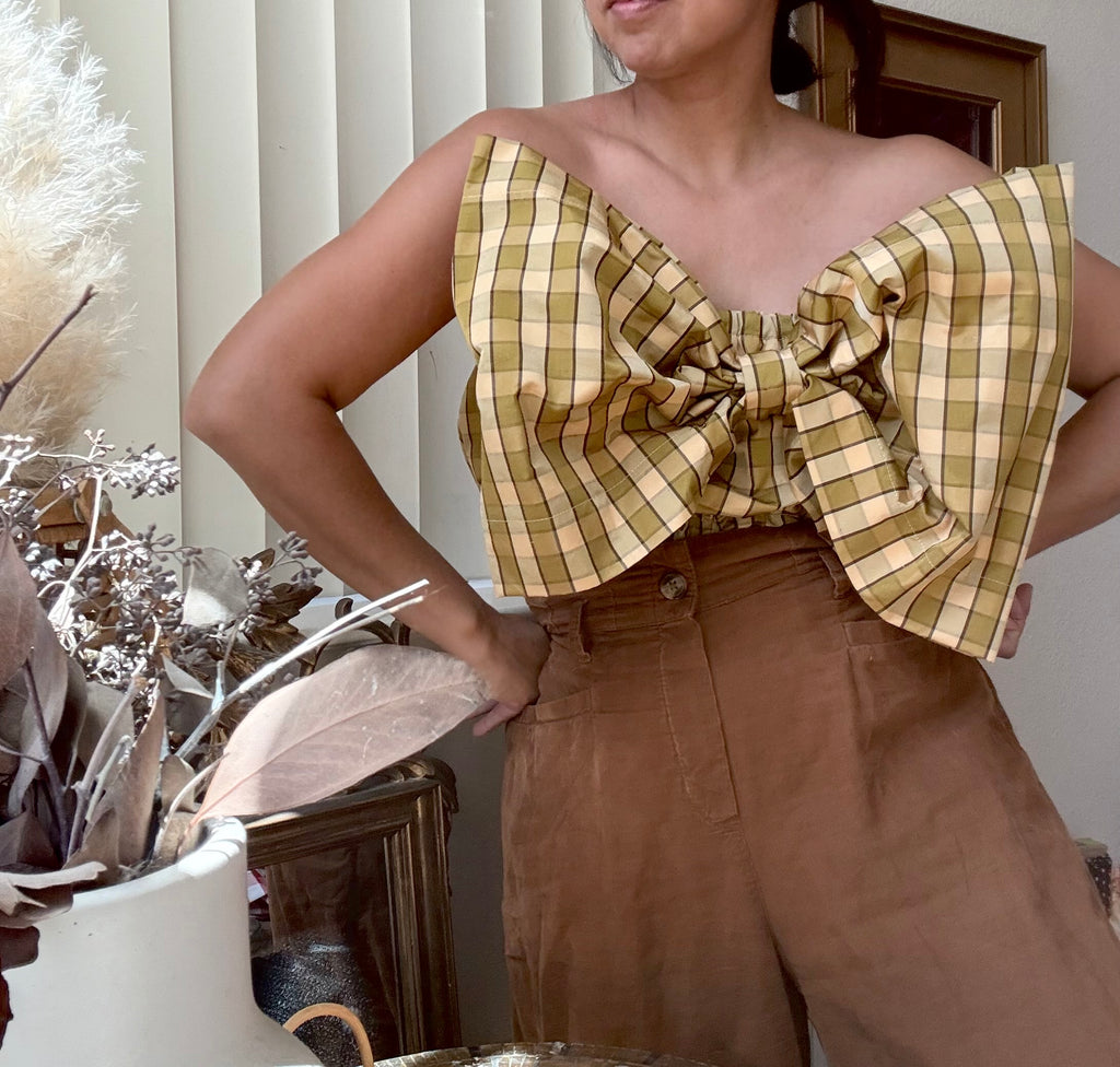 This top is made with a cropped bodice- made to cover bust and just enough of your midriff so you don’t show any tummy. Pairs perfectly with high waisted jeans!