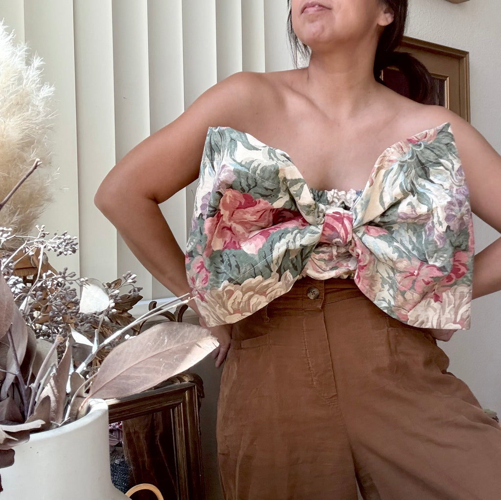 This top is made with a cropped bodice- made to cover bust and just enough of your midriff so you don’t show any tummy. Pairs perfectly with high waisted jeans!