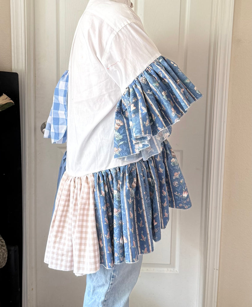 All ruffled tunics/dresses are made from vintage/reworked button ups and range in different sizes.